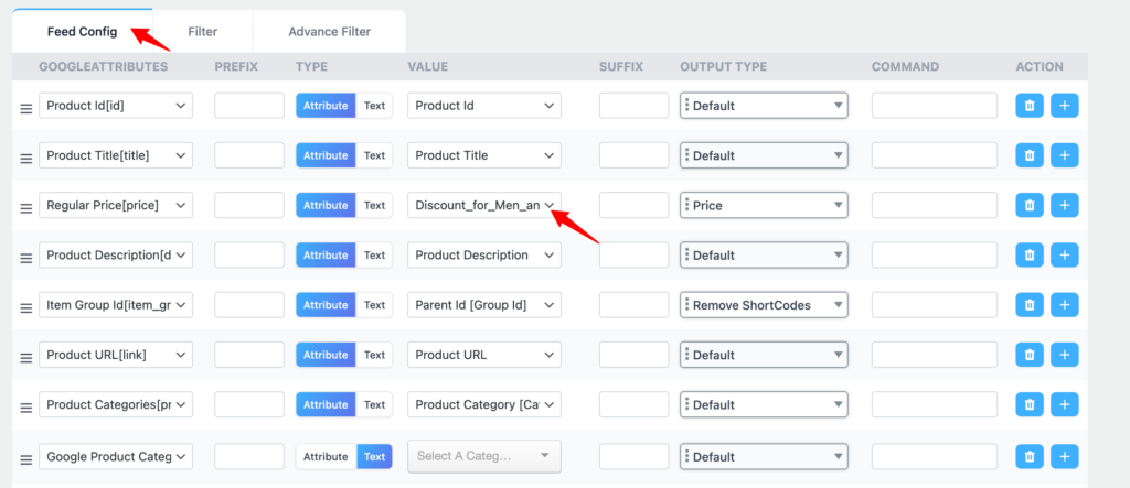 Open your feed and scroll to the field list. Find the Price field. Click the value dropdown on the right side. Look for the group called Dynamic Attributes — your new rule will be listed there. Select a discount for Men and Women.