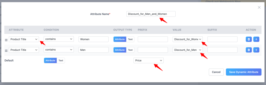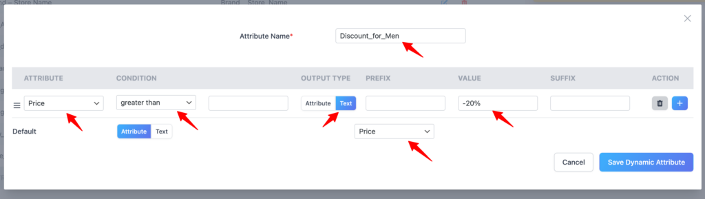Go to CTX Feed → Dynamic Attributes → Add New. Name it Discount for Men and Women.