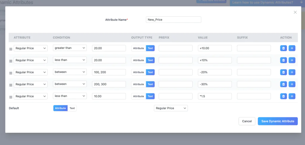 Use a Dynamic Attribute feature to modify the price sent in your product feed — increase it by a percentage, decrease it, multiply, or divide — without changing actual WooCommerce prices. The original store price stays untouched; only the feed value changes.
