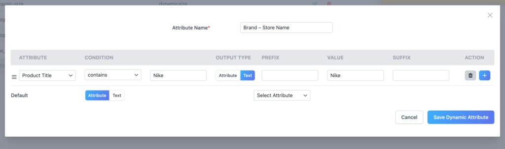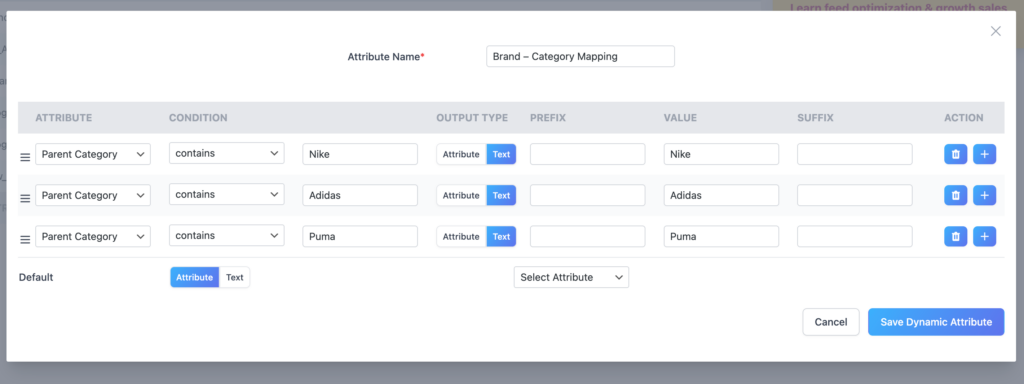 Google requires a brand attribute for all branded products. If your WooCommerce store doesn’t have a dedicated brand field — or if brand data exists in a category, tag, or custom attribute — CTX Feed’s Dynamic Attributes let you map that data into the feed automatically, no matter how many products you have.