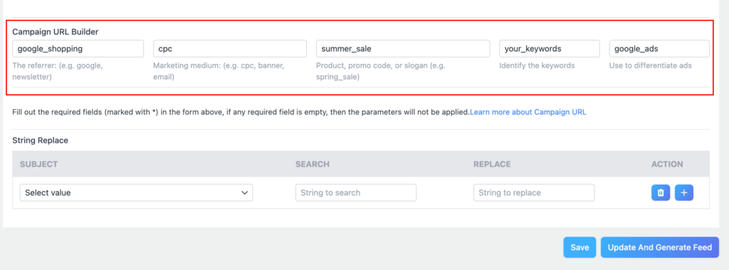 - Click Update and Generate Feed to save your changes and rebuild the feed with the new parameters added to every product URL.