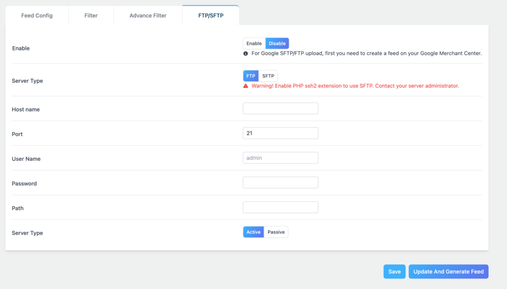 For Google Merchant Center Before configuring FTP here, you need to create a feed inside your Google Merchant Center account first. Google will give you the FTP host name, username, and password from there. Set up the feed in Google first, then come back here to enter those details.